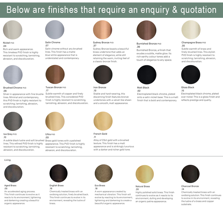 • Aged Brass .05, English Brass .16, Eco Brass .18, Natural Brass .20, Charcoal Brass .14, Stable finishes – Nickel PVD .04, Satin Chrome .07, Sydney Bronze PVD .37, Burnished Bronze PVD .36, Champagne Brass PVD .35, Brushed Chrome PVD .06, Tuscan Bronze PVD .17, Iron Bronze .13, Matt Black .02, Gloss Black .15, Ice Grey PVD .10, Ultra PVD .03, French Gold .11
