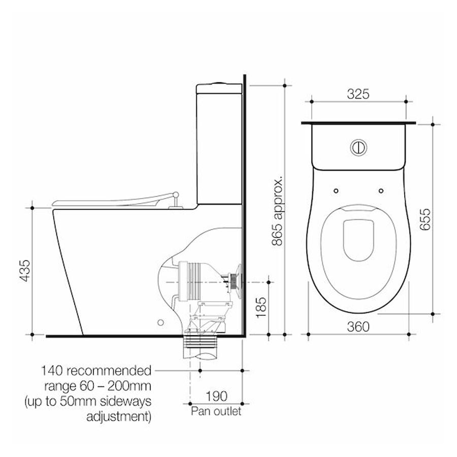 Dimensions: 360 W x 865 approx. H x 655mm D – S-trap set-out 140 recommended range 60-200mm (up to 50mm sideways adjustment) P-trap set-out 185mm3