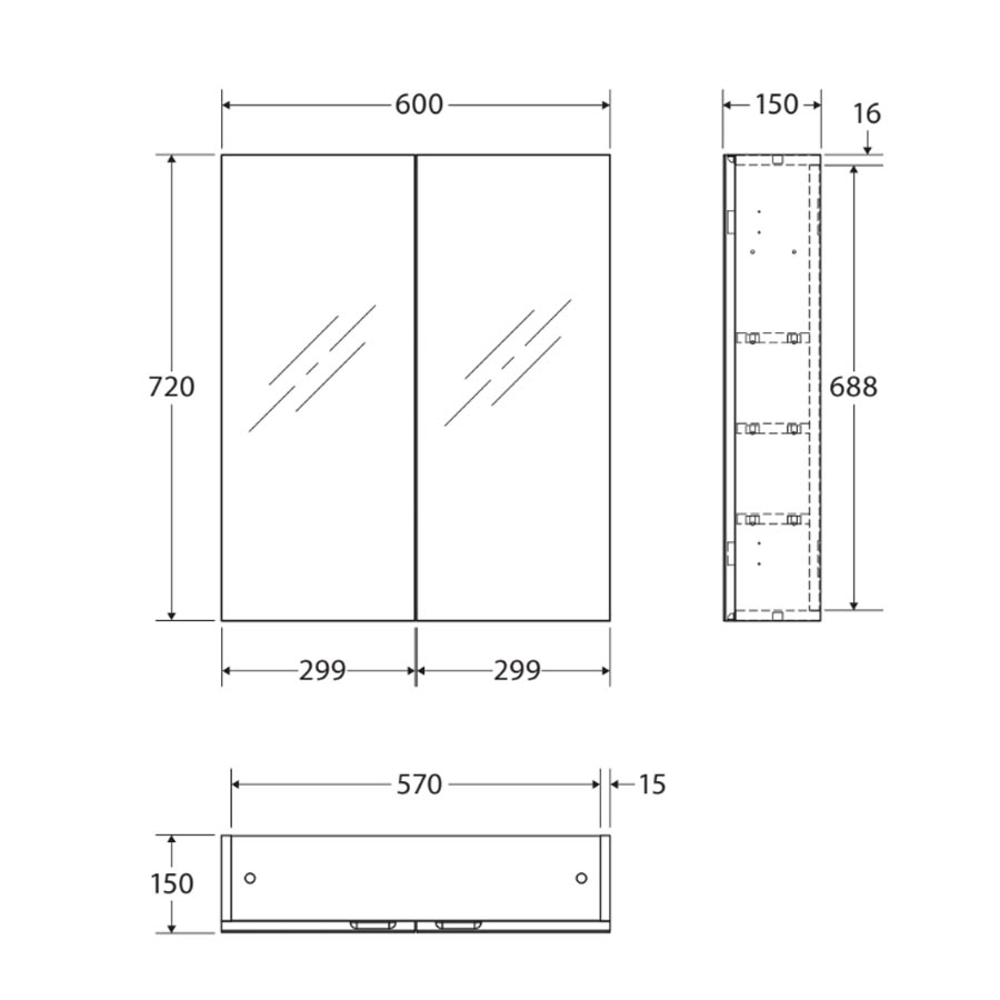 Dimensions: 600 W x 720 H x 150mm D
